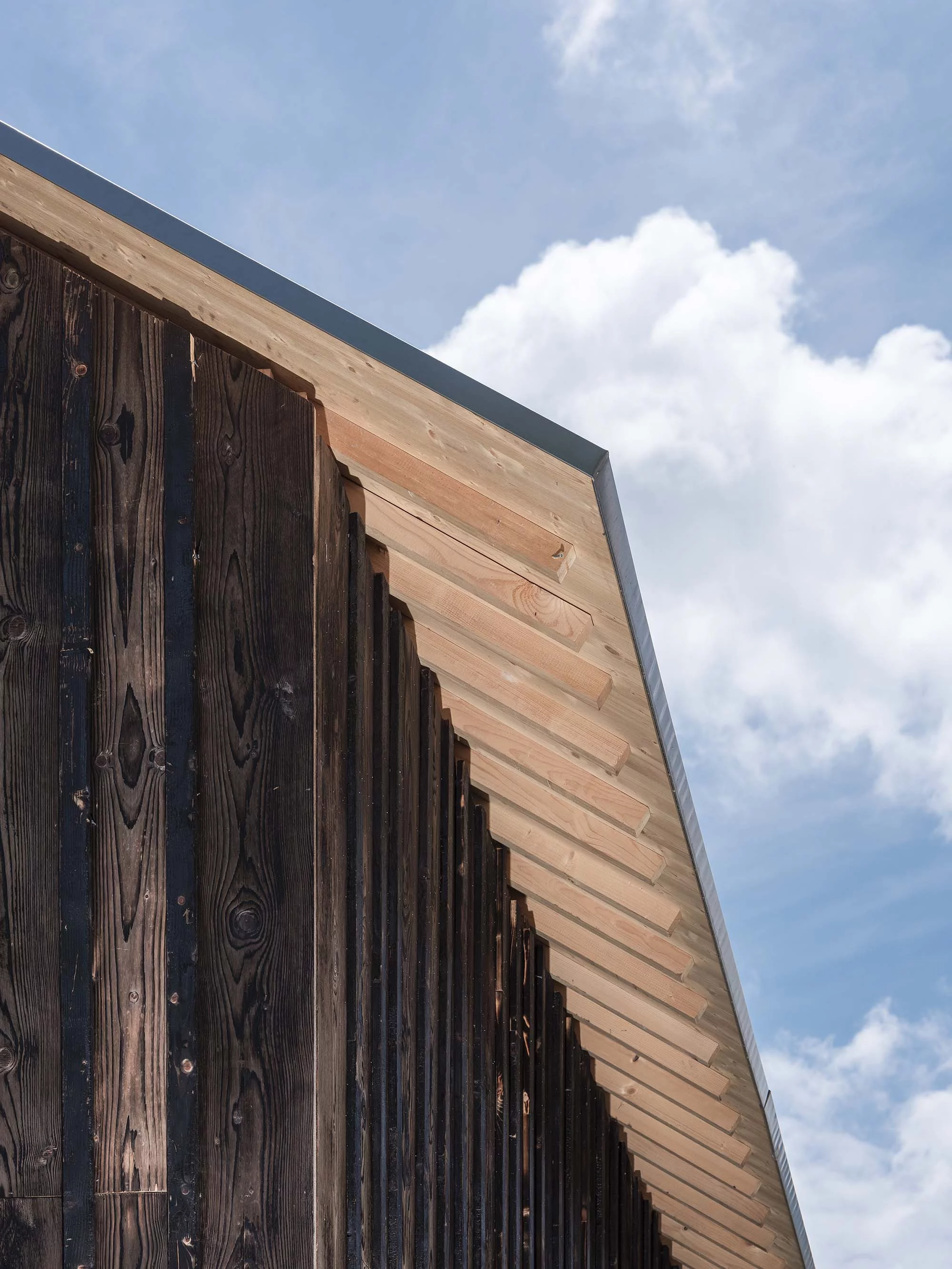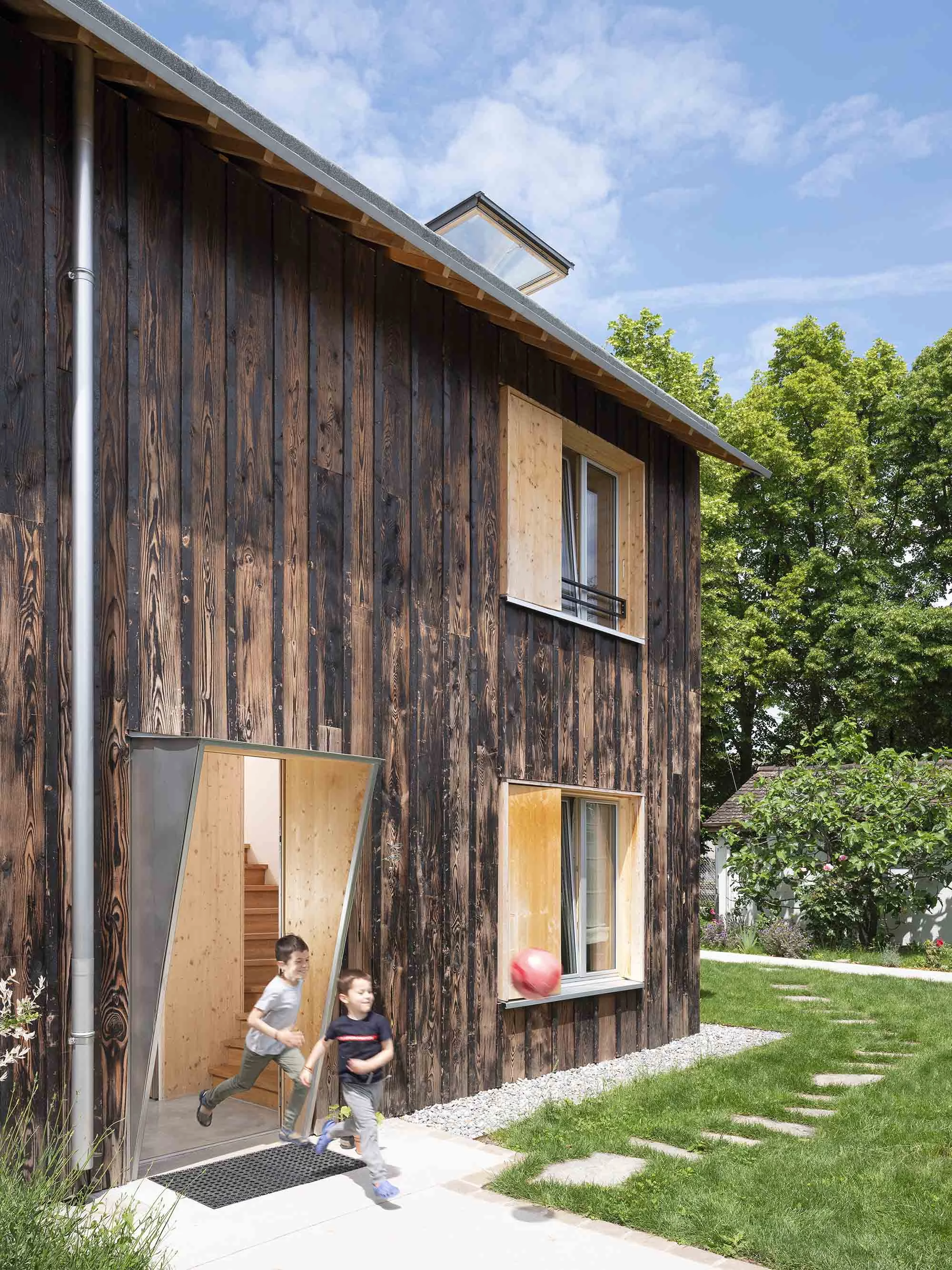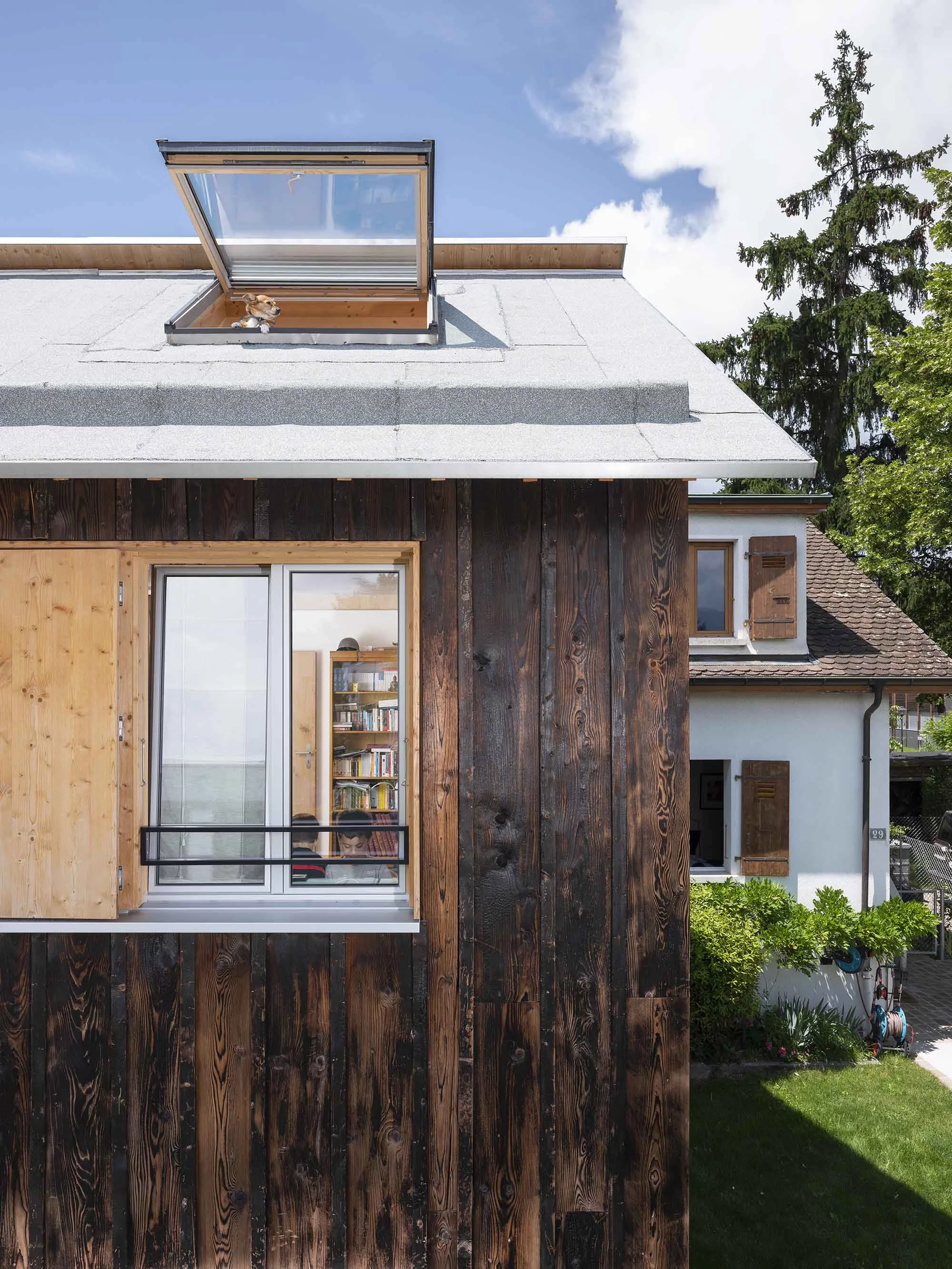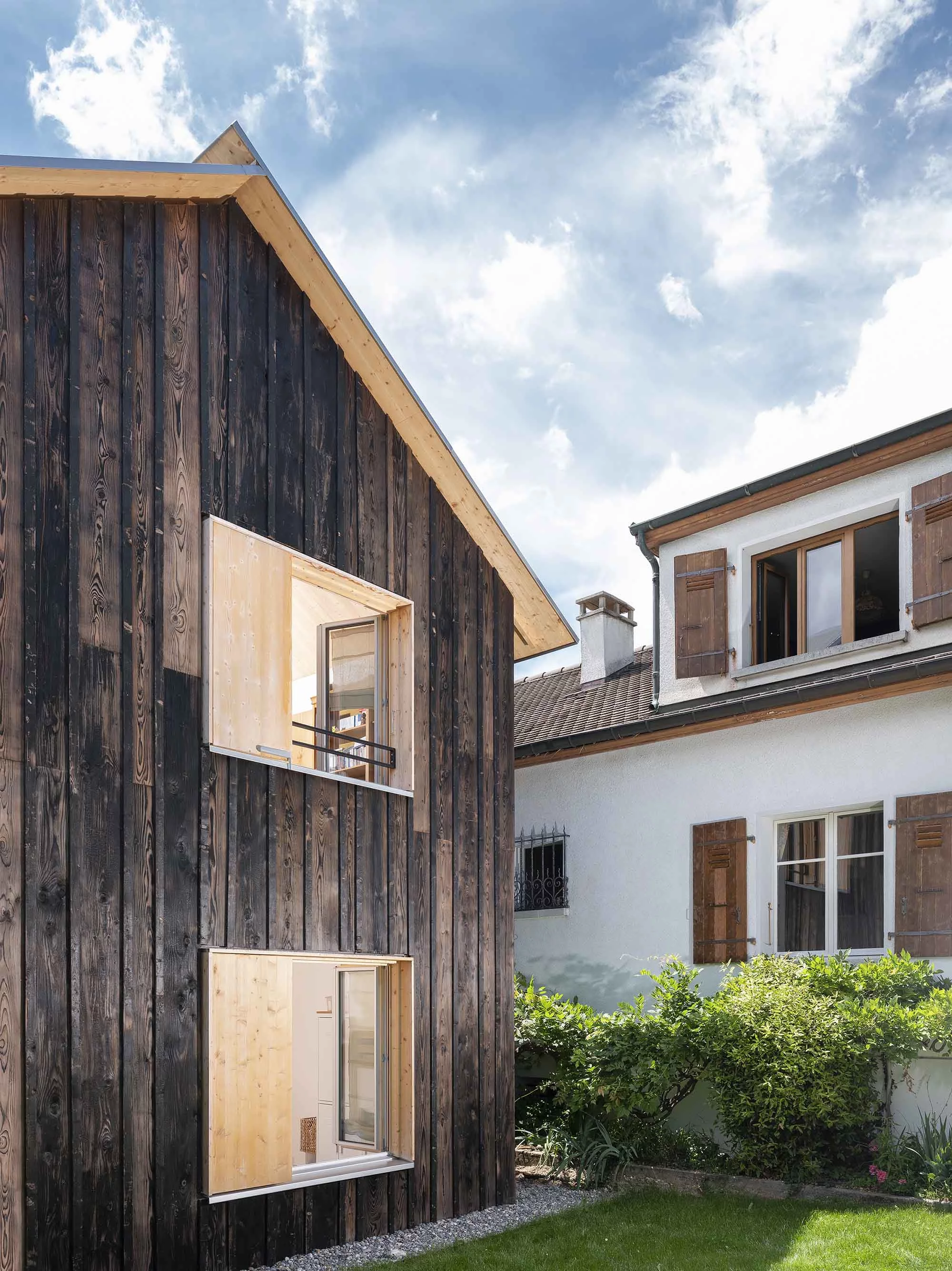 Plusieurs choix constructifs ont permis de donner à cette maison un caractère singulier et d’éviter des détails onéreux. La structure en bois préfabriquée a réduit la durée du chantier et offert un bâtiment hors d’eau en une seule journée. La toiture à deux pans est entièrement recouverte d’un lès bituminé qui enrobe des carrelets pour faire les chenaux sans recourir à la ferblanterie habituelle. La façade en bois brulé est faite de planches de coffrages peu onéreuses aux dimensions aléatoires permettant une mise-en-œuvre facile en autoconstruction. À l’intérieur, des chapes brutes sont laissées apparentes.