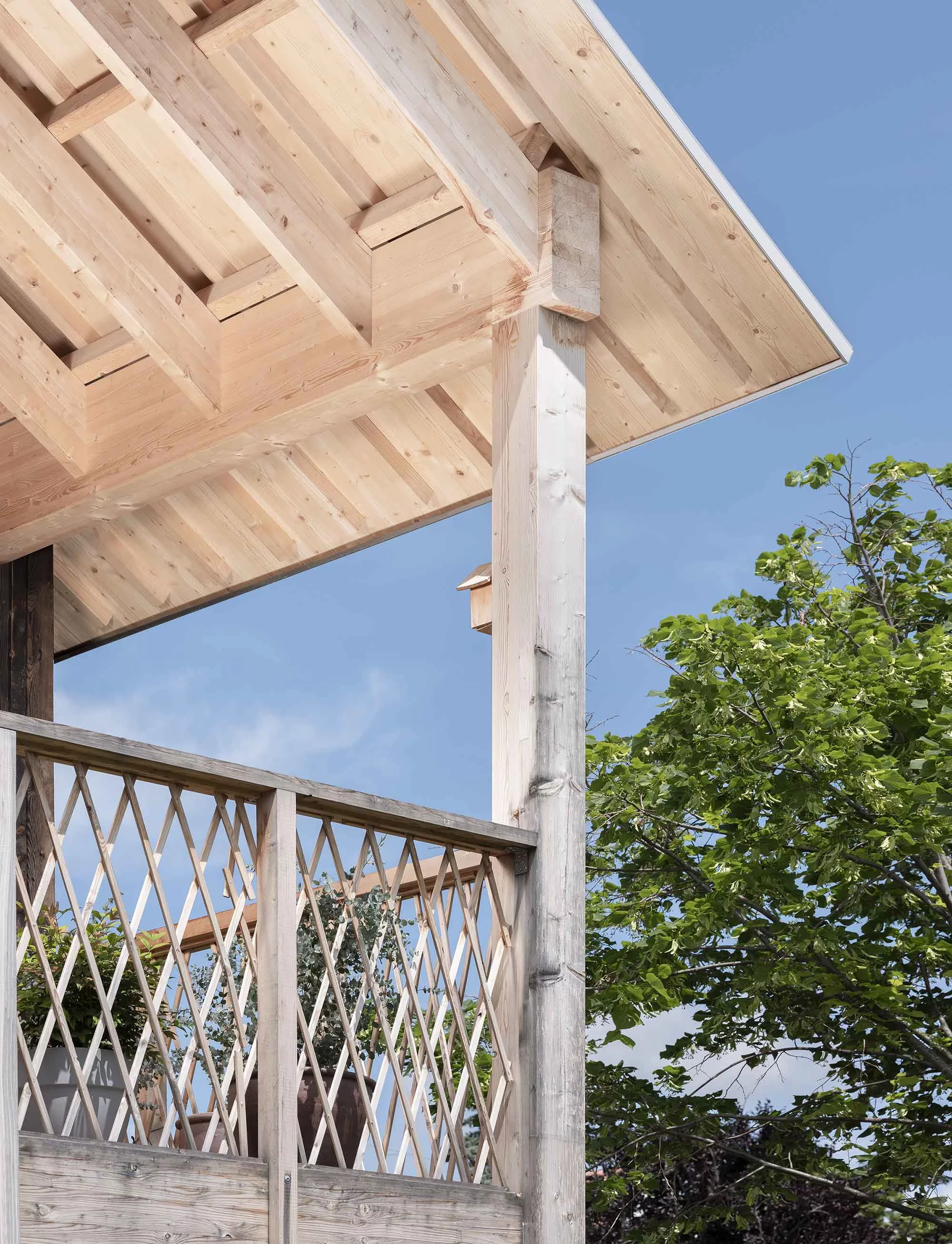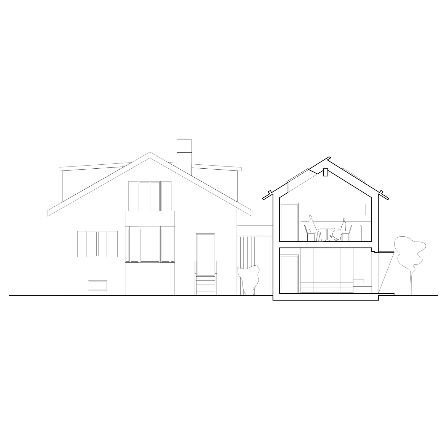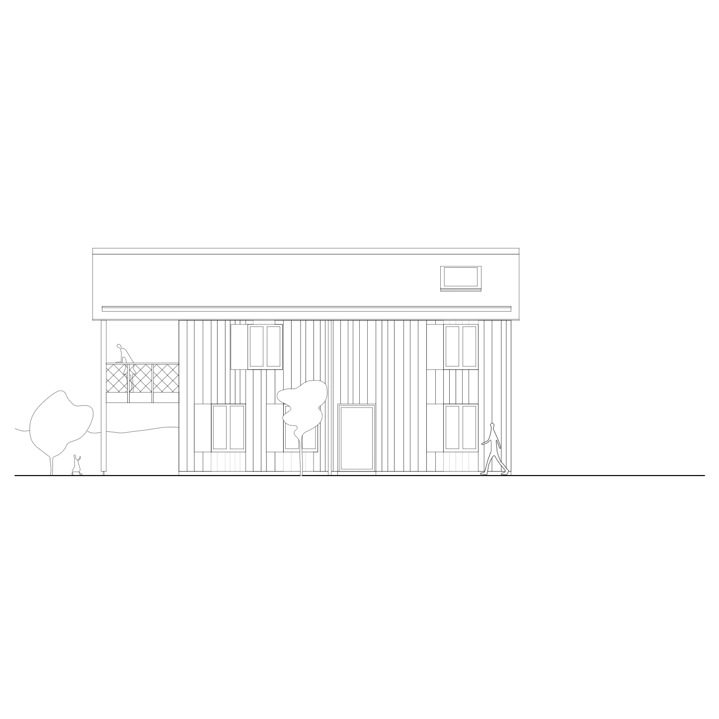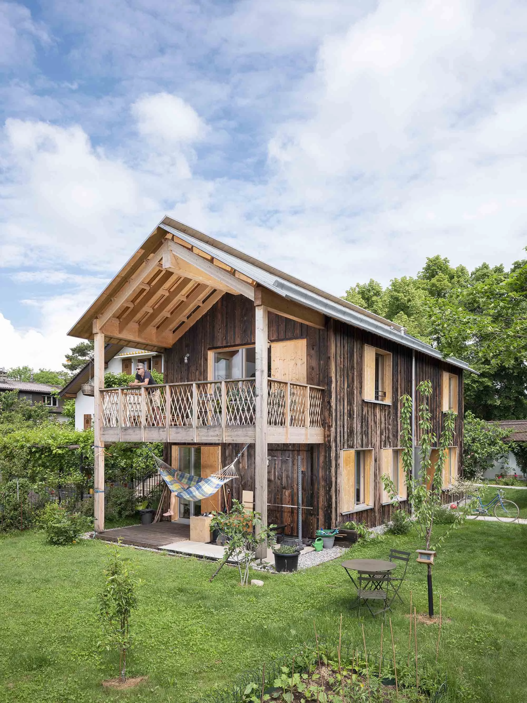 Plusieurs choix constructifs ont permis de donner à cette maison un caractère singulier et d’éviter des détails onéreux. La structure en bois préfabriquée a réduit la durée du chantier et offert un bâtiment hors d’eau en une seule journée. La toiture à deux pans est entièrement recouverte d’un lès bituminé qui enrobe des carrelets pour faire les chenaux sans recourir à la ferblanterie habituelle. La façade en bois brulé est faite de planches de coffrages peu onéreuses aux dimensions aléatoires permettant une mise-en-œuvre facile en autoconstruction. À l’intérieur, des chapes brutes sont laissées apparentes.