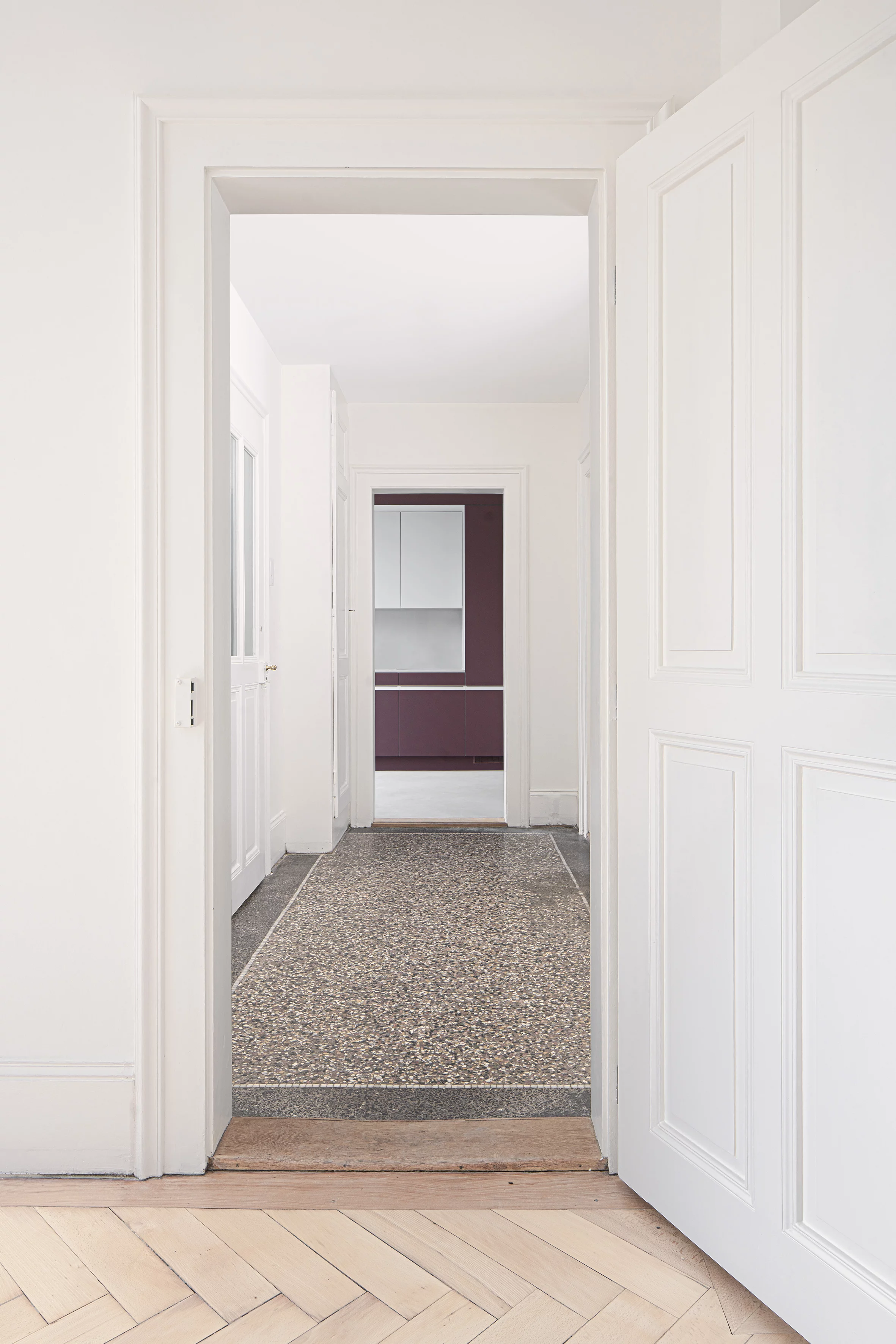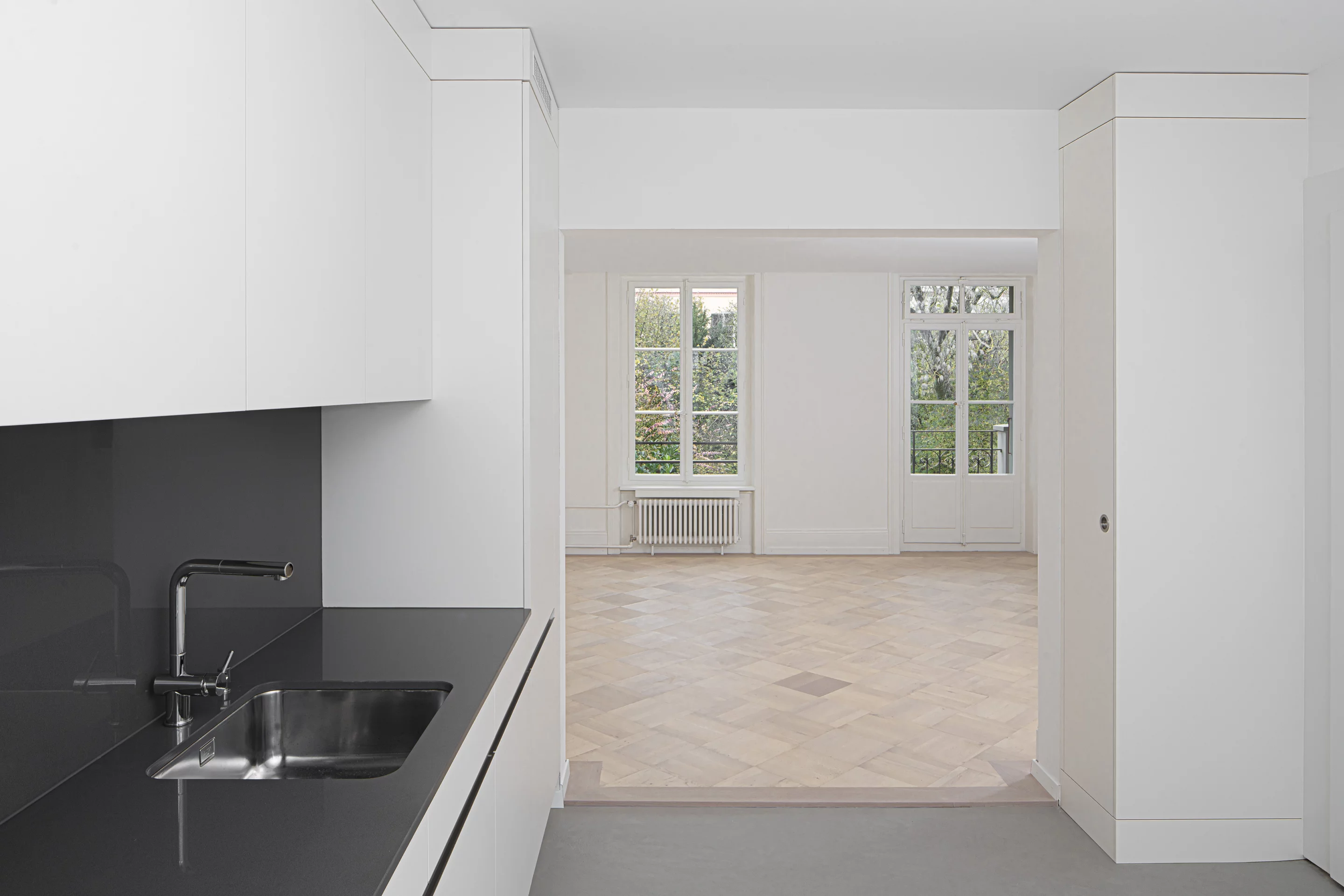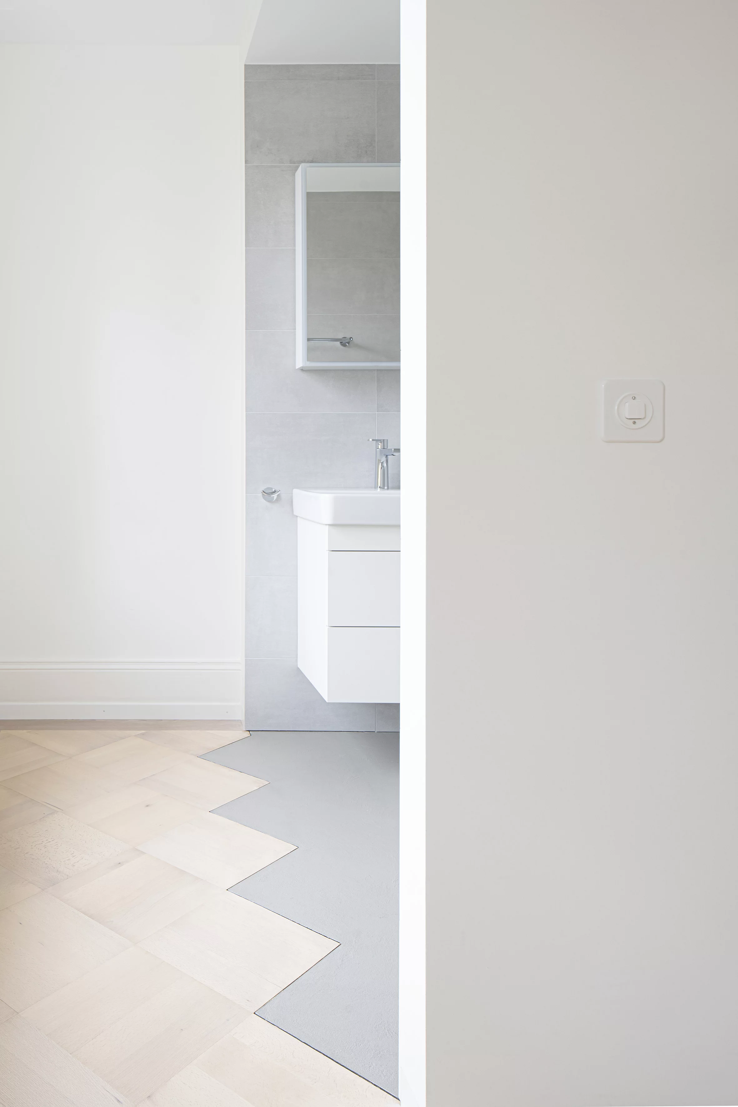 La transformation spatiale des appartements se veut minimale: dans la chambre une nouvelle boîte accueille de nouvelles salles d'eau, créant une suite parentale. Les cloisons apparues au fil des transformations sont supprimées afin de retrouver les espaces d'origine.