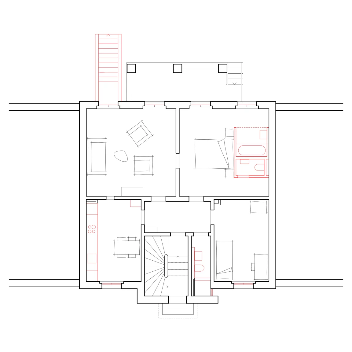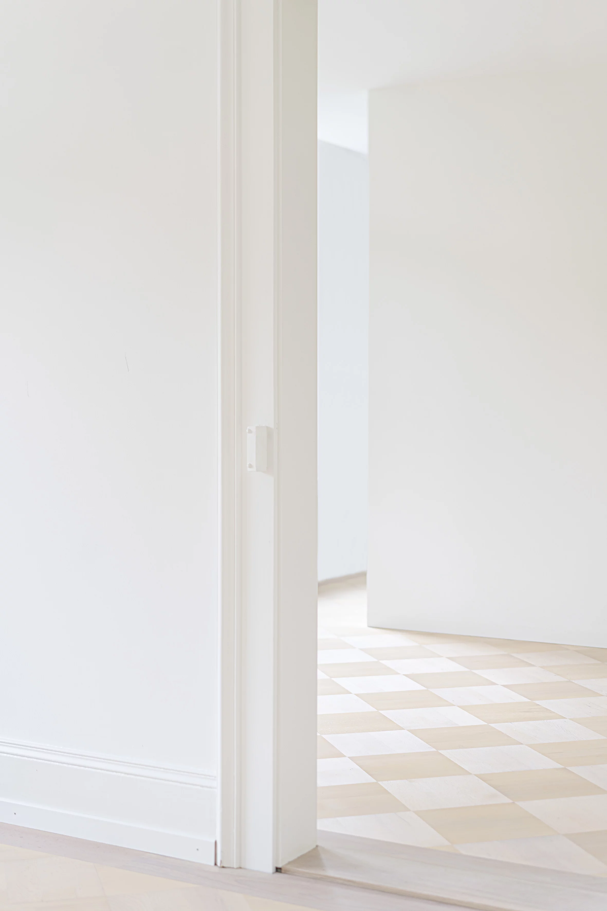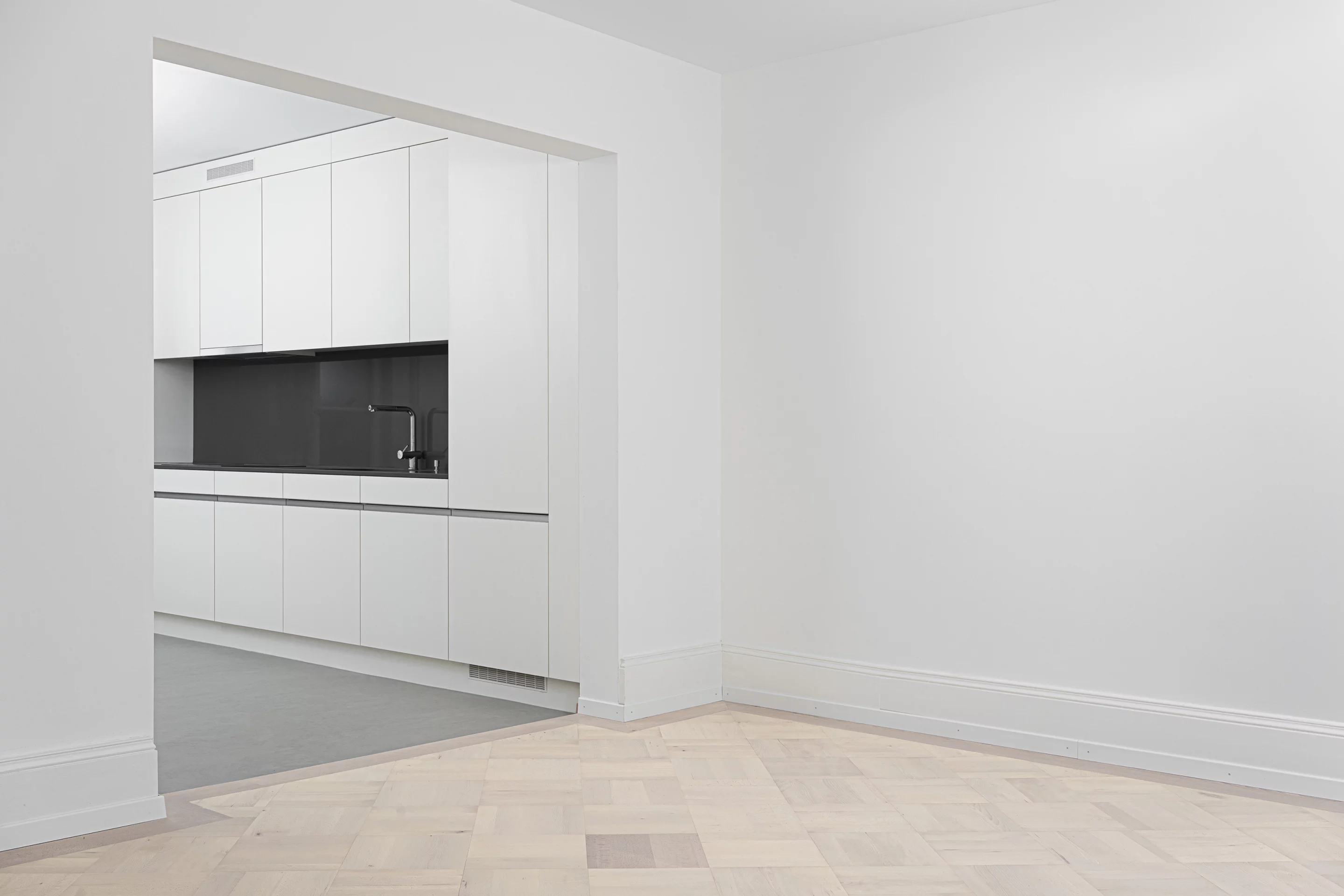 La transformation spatiale des appartements se veut minimale: dans la chambre une nouvelle boîte accueille de nouvelles salles d'eau, créant une suite parentale. Les cloisons apparues au fil des transformations sont supprimées afin de retrouver les espaces d'origine.