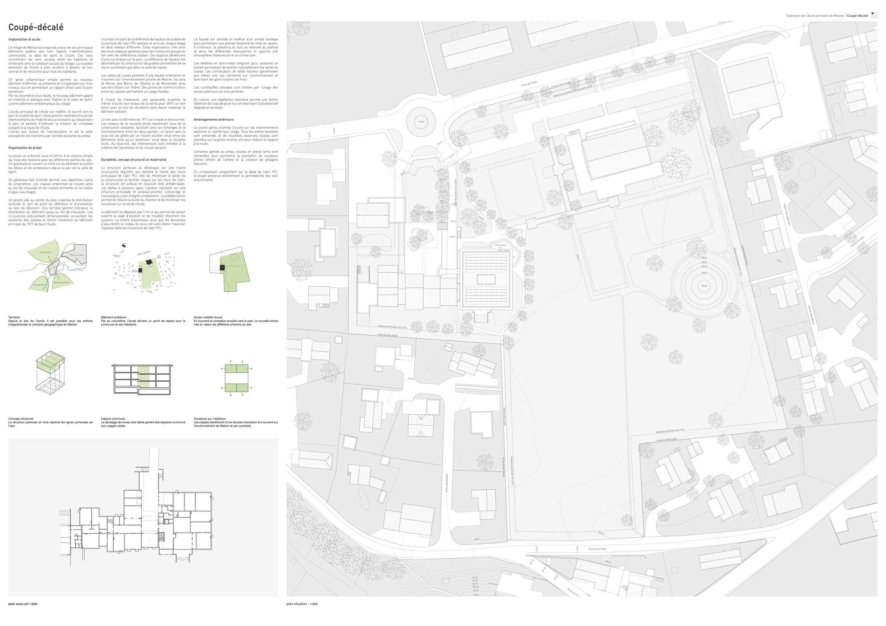 Le projet se présente sous la forme d’un volume simple qui tisse des relations avec les différentes parties du site. Un grand parvis couvert au nord-est du bâtiment accueille les élèves et les professeurs depuis le par cet la salle de sport.