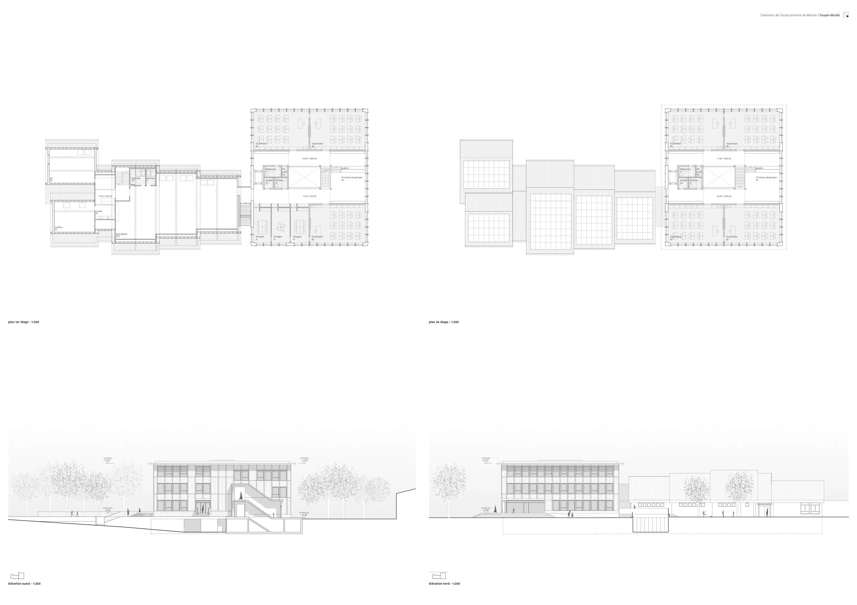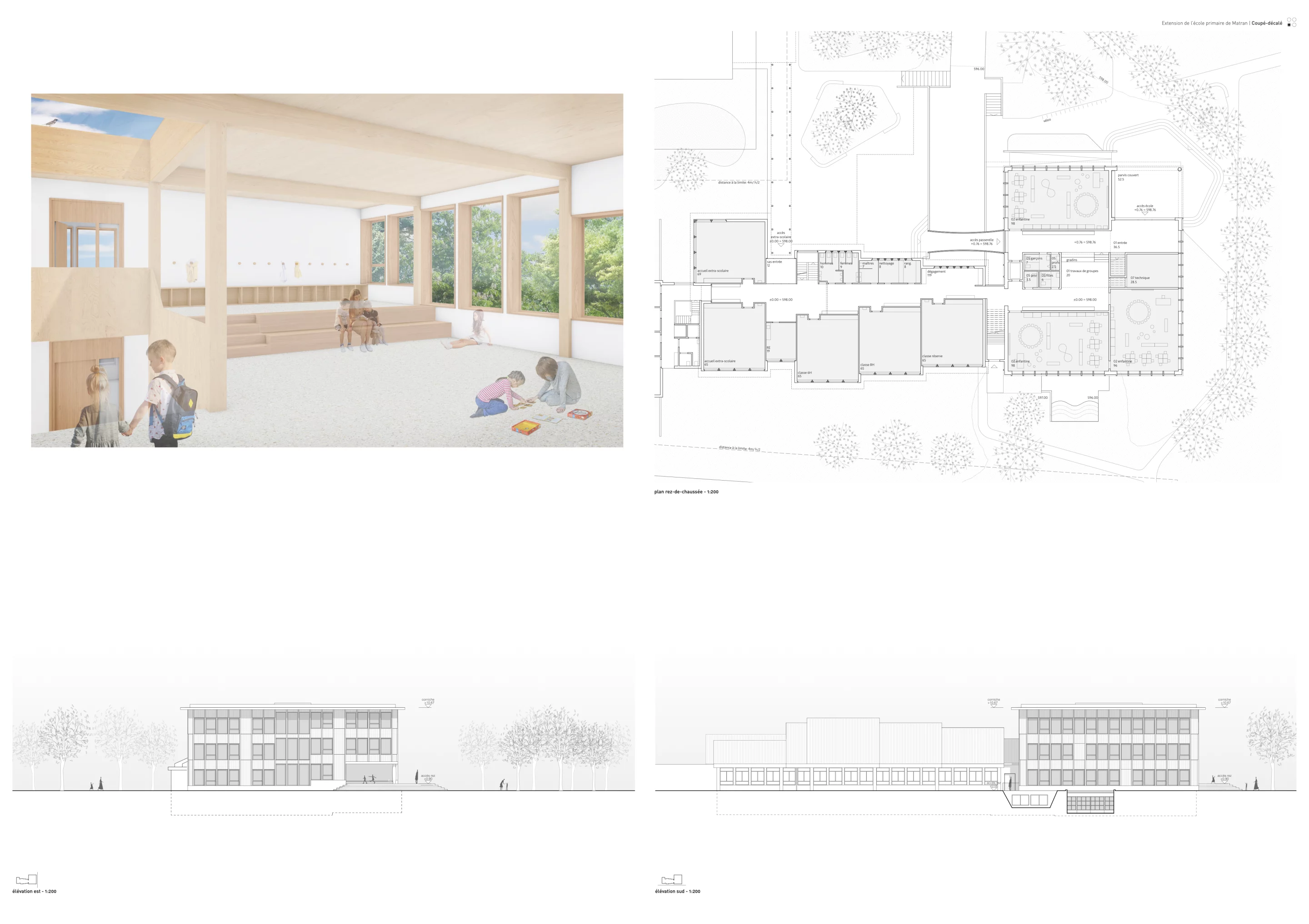 des sous-espaces généreux pour les travaux en groupe en lien avec les différentes classes. Ces espaces bénéficient d’une vue directe sur le parc. La différence de hauteur est absorbée par la construction de gradins permettant de se réunir autrement que dans la salle de classe.