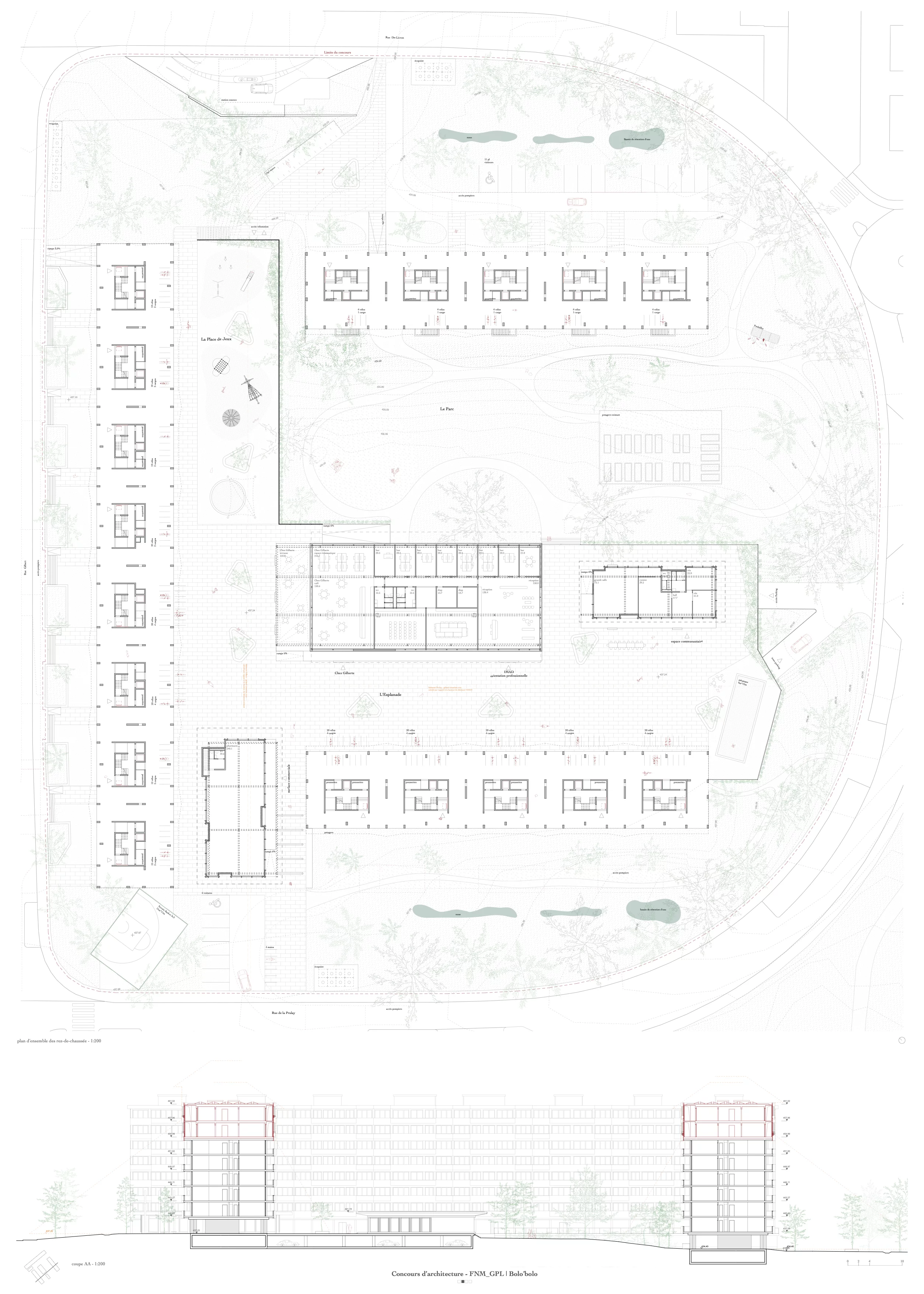 Le projet valorise l’esprit ville-jardin comme fil rouge de l’intervention. Les bâtiments forment une sorte de filtre qui isole l’espace central de l’agitation urbaine tout en maintenant une ouverture vers le contexte immédiat. La pleine terre est réaffirmée comme matrice du projet, avec une gestion de l’eau par noues et bassins, favorisant à la fois la biodiversité et la résilience climatique. Le jardin est conçu comme un espace de calme, propice à la détente et à l’oisiveté, tandis que les activités sportives sont relocalisées en périphérie. Les potagers existants sont maintenus et de nouvelles parcelles cultivables sont aménagées, avec la possibilité d’y adjoindre des petits élevages urbains (ex. poulaillers). Le parc est aménagé avec légèreté : une simple promenade structure l’espace sans le figer. L’esplanade, nouvellement définie, devient le lieu des usages collectifs : circulation, jeux, rencontres, événements. Un grand nombre d’arbres est planté en périphérie, complétant la couronne existante interrompue par les anciens parkings. Certaines zones sont volontairement restreintes à l’usage humain pour renforcer la trame écologique interne à la parcelle.