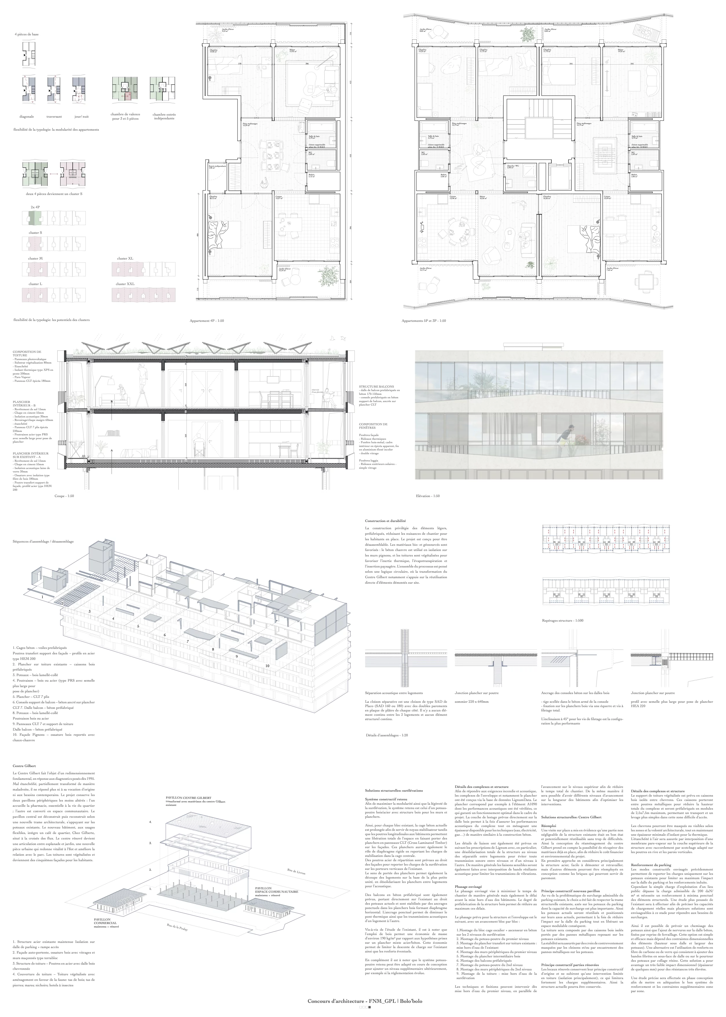 La construction privilégie des éléments légers, préfabriqués, réduisant les nuisances de chantier pour les habitants en place. Le projet est conçu pour être désassemblable, et potentiellement réplicable aux étages inférieurs lors de futures rénovations. Les matériaux bio- et géosourcés sont favorisés : le béton chanvre est utilisé en isolation sur les murs pignons, et les toitures sont végétalisées pour favoriser l’inertie thermique, l’évapotranspiration et l’insertion paysagère. L’ensemble du processus est pensé selon une logique circulaire, où la transformation du Centre Gilbert notamment s’appuie sur la réutilisation directe d’éléments démontés sur site.